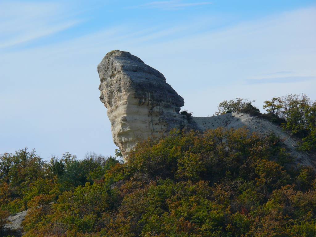 Родной брат скалы Курбан-Кая находится в 666 км (любители мистической арифметики, внимание!), охраняет территорию природного заповедника Бучеджи в Румынии. Песчаник и известняк оказались прекрасным материалом, которому природа придала человекоподобные черты. Слоистая структура породы рождает впечатление, что голова выныривает из каменного моря. И вот что удивительно: в зависимости от освещения, времени года, погоды выражение лица может меняться.