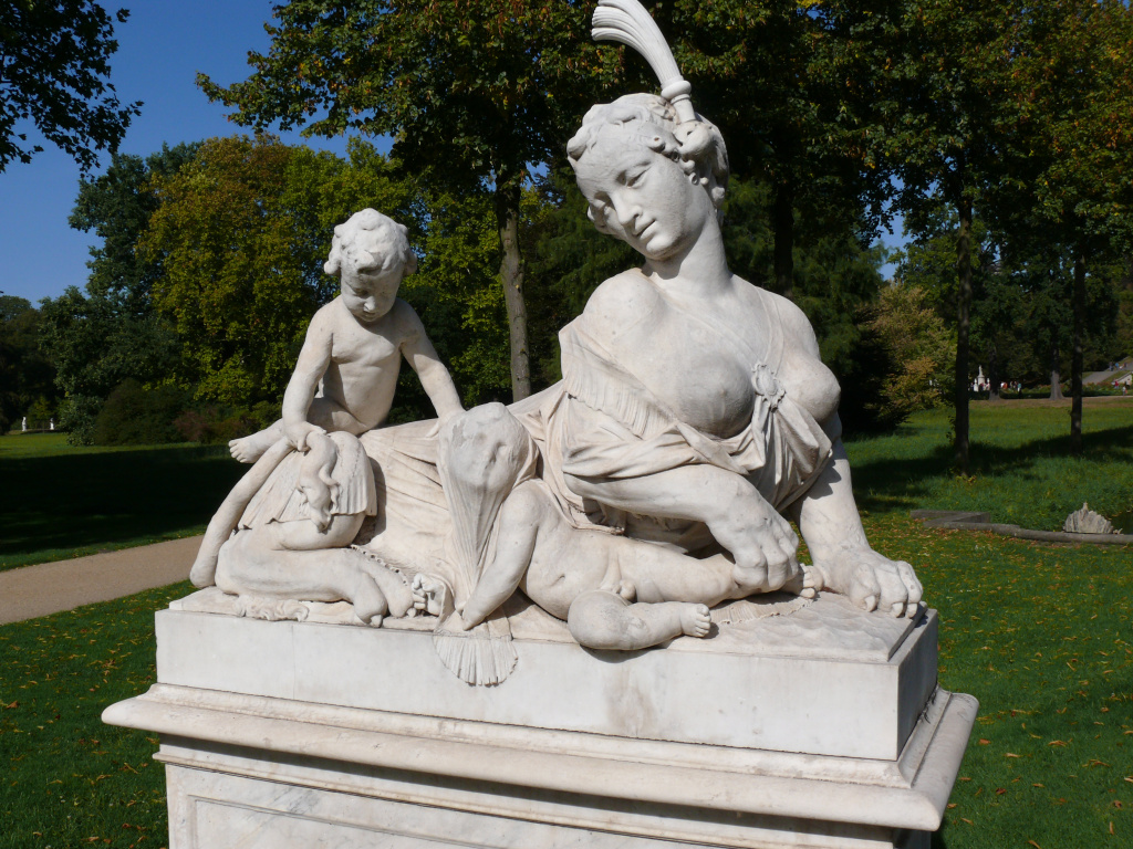 Мода на парковые аллегорические скульптуры пришла в Европу из мифологии античности. Как и в эпохи Древнего Египта и античной Эллады, сфинкс символизирует защиту священных мест и границ, олицетворяет знание, скрытое под покровом загадки. Но не зря Сан-Суси переводится как «без забот»: дамы с львиным телом мирно играют на лужайке с человеческими детёнышами.