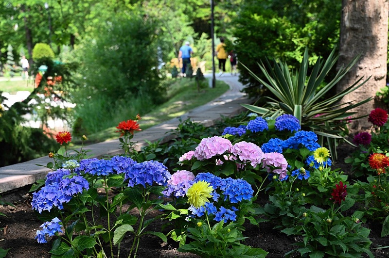 Ещё 150 кустов георгин высадили в парке им. Гагарина в Симферополе. Разноцветные бутоны красиво украсили клумбы у пруда. Эти посадки стали частью работ по обновлению зелёных зон парка: всего за последний месяц работниками «Парков столицы» высажено более 500 кустов гортензий и георгин.