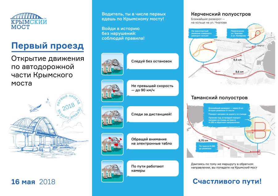 Движение по Крымскому мосту для автомобилей будет открыто в 05:30 по московскому времени 16 мая 2018 года. Это на полгода раньше предусмотренного госконтрактом срока (декабрь 2018 года). Первыми по мосту проедут местные жители – крымчане и кубанцы.