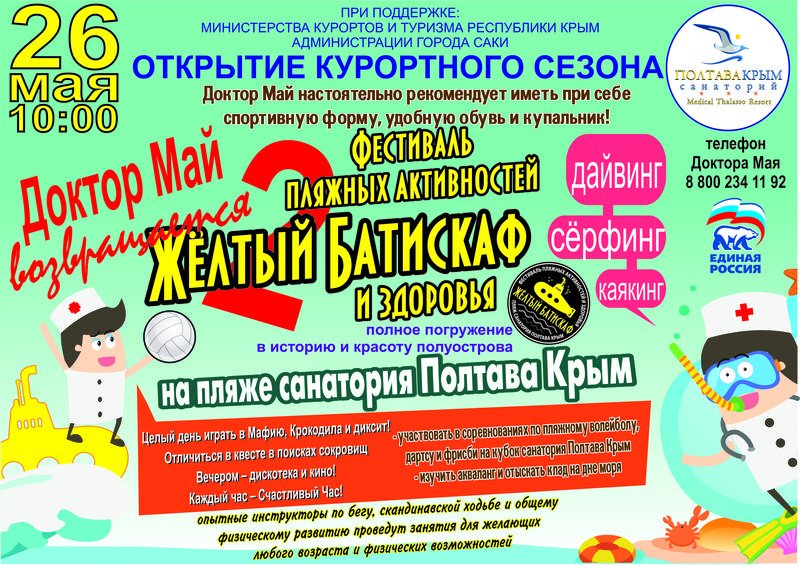 26 мая с 10 утра и до самого вечера на территории «Клинического санатория «Полтава-Крым» в городе Саки пройдет второй фестиваль водных видов спорта «Желтый батискаф — 2018».