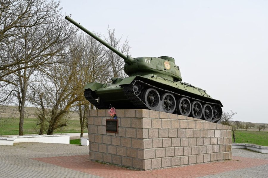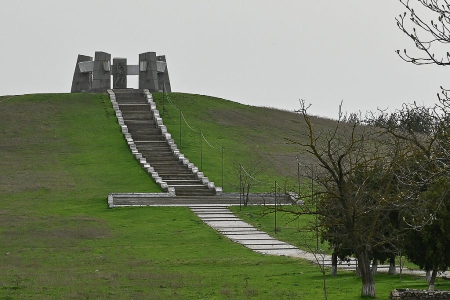 Село Геройское Сакского района привольно раскинулось на степном просторе. Здешний ландшафт существенно разнообразят курганы. Они молчаливо, но выразительно рассказывают о наполненной драматическими событиями истории края. Много тысяч лет назад курганы служили усыпальницами скифских воинов. Одна из многометровых насыпей, увенчанная уникальным памятником, повествует о беспримерном подвиге, совершённом 80 лет назад людьми, для которых верность воинскому долгу стала дороже жизни.
