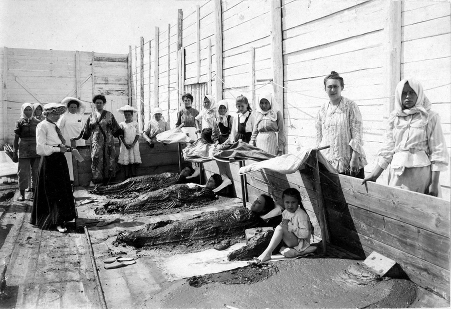 Initially the patients were treated by almost complete burying in the mud. On the lake shoreline a pit was dug, the patient was placed there and then covered with a layer of dirt – “so that there would be no holes anywhere”. The patient lay in the mud bath as long as he could, “as long as the forces and the disease conditions allowed”. Most of patients had their forces for about forty minutes and then they started to feel singing in the ears, heartbeat and vertigo. Those brought up to the mark were took out of the pit at all speed, washed the mud off them and put to bed for a good sweat.