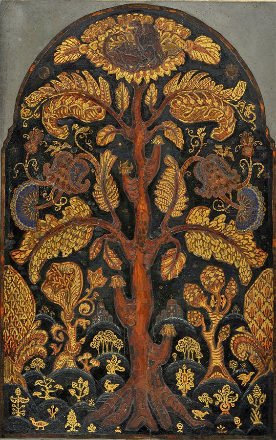 Рерих разработал и исполнил в мозаике внутреннее убранство часовни. Золотая смальта отсылает к происхождению фамилии художника («куюмджи» в переводе означает «золотых дел мастер»). Величие искусства Куинджи символизирует древо жизни, объединяющее все сферы мироздания. На вершине древа находится гнездо с птенцами: так ученики воплотили свою благодарность Архипу Ивановичу, отечески их опекавшему.