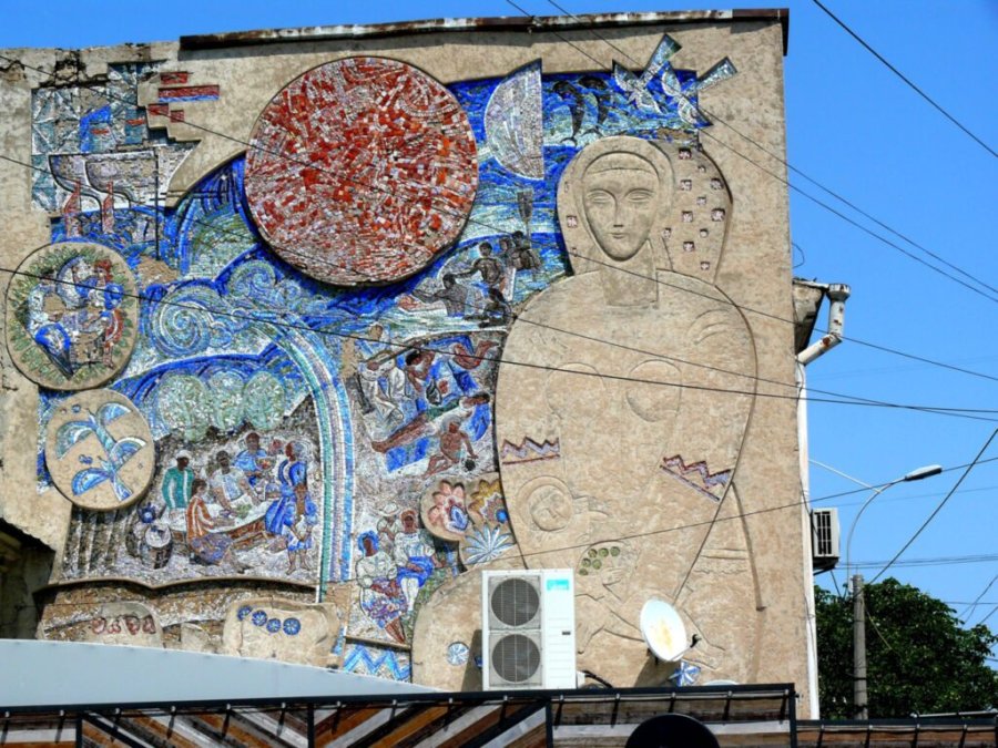 В начале 70-х годов минувшего века в самом центре крымской столицы появилось огромное мозаичное панно. На фоне жизнерадостных сюжетов, объединённых темой «воздух, солнце и вода», резко выделяется женщина с ребёнком на руках. Очевидно, что художник, мастер социалистического реализма, взял за основу облик Богородицы с младенцем.