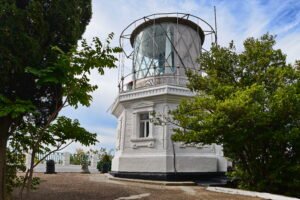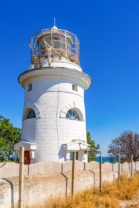 Сложные чувства испытывали здесь и моряки: акватория вблизи мыса изобилует подводными скалами и требует особого внимания. В 1895 году на вершине Меганома выросла элегантная башня маяка. Оптическое оборудование заказали у лучшего в мире производителя – французской компании «Барбье & Бенар». До сих пор хранится на маяке реликвия – бронзовая табличка, на которой отчеканены название фирмы, год и место производства: «Париж, 1895».