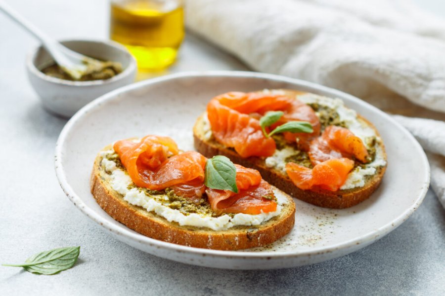 Ломтики багета подсушить в тостере или на сухой сковороде. Намазать хлеб сыром, положить сверху слайсы рыбы. Слегка полить песто и украсить микрозеленью.