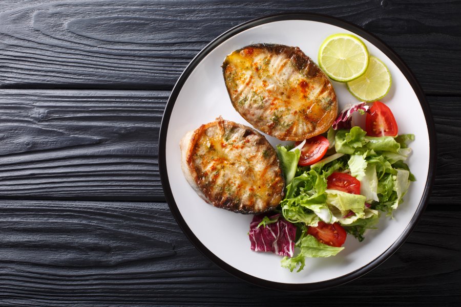 Стейк из осетрины с овощами