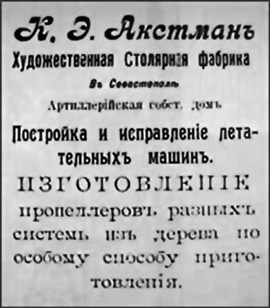 The first Crimean-made airplanes were manufactured in Sevastopol — at the Axtman’s woodworking factory. You shouldn’t be surprised at such a weird “place”: major aircraft parts were produced of wood at that time, thus some aircraft-building plants were established on the base of furniture and woodworking factories.