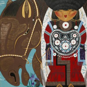 Одна из работ художницы называется «Пого. Наследие». Пого – это украшение-оберег, закрывающее грудь и живот замужней женщины, вышитое с использованием перламутровых пуговиц, раковин каури, бисера и монет. У каждого рода свой узор, в котором «зашифрованы» данные о роде, количестве детей и более детальная информация, которая была предназначена только для хранителей рода. Мастерство создания пого передается из поколения в поколение, от матери к дочери. В работе художница изобразила процесс обучения мастерству изготовления оберега через поколение – от бабушки к внучке – нить, связывающая прошлое и настоящее.