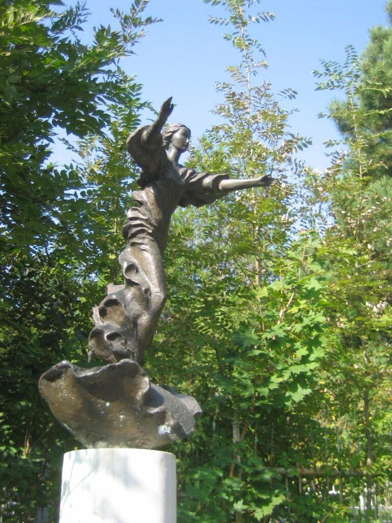 Византийскую колонну, специально привезённую из Херсонеса Таврического, прообраза Гринландии, венчает бронзовая Фрези Грант – героиня романа «Бегущая по волнам». Её широко распростёртые руки напоминают крест.