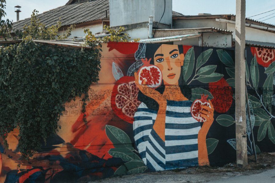 А яркое граффити с гранами «Путешествие в Судак» на лице Октябрьской, 5, вероятно, станет популярной локацией для селфи. Автор эскиза – Анна Баранова, художница и участница молодёжного творческого сообщества изобразительного искусства «Таврида.Арт». Вместе с художницей Анастасией Нан они говорят о городе через идеи обмена и обилия: как гранат наполнен множеством зёрен, так Судак богат товарами и культурными обменами, и открывать для себя город – то же самое, что раскрывать плод граната.