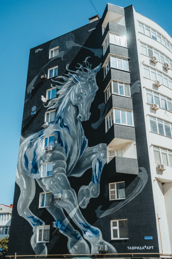На ул. Гагарина, 42, художники нарисовали «Красного коня». На «Цветочной акварели» на стене дома на ул. Гвардейской, 33, всегда будут цвести розы. А масштабная надпись на ул. Цветочной, 19, утверждает главный туристический принцип: «Все дороги ведут в Рим Крым. Пиши правильно!»