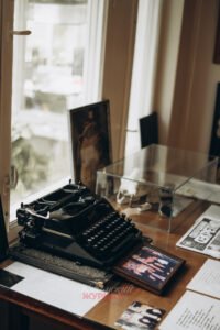 В кабинете привлекают внимание массивный письменный стол с атрибутами советского писателя – пишущей машинкой, диктофоном, карманным цветным телевизором – и полки с книгами, необходимыми для текущей работы.