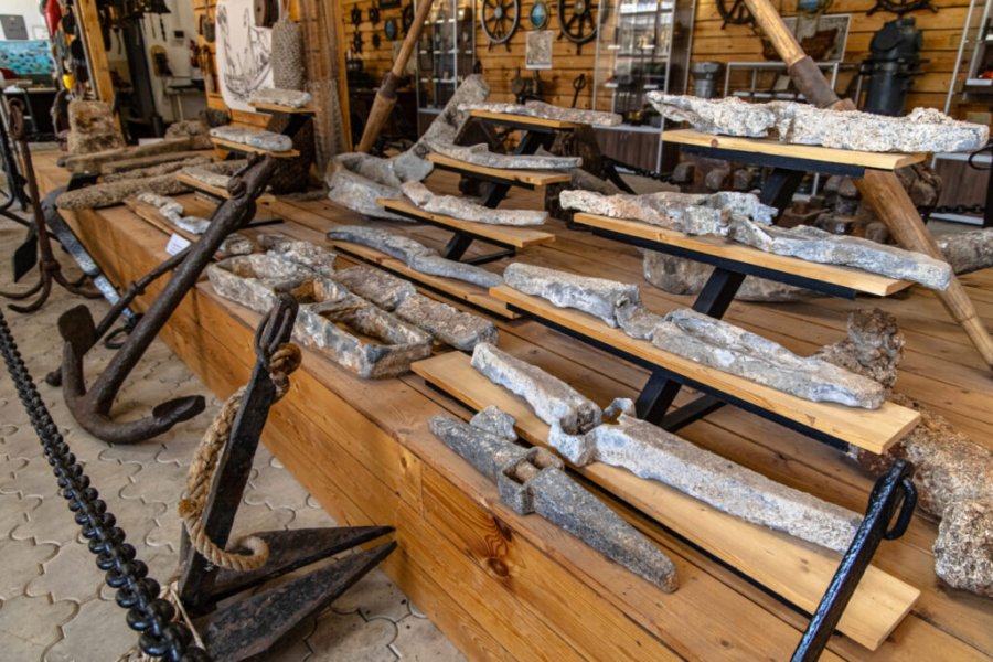 - В музее представлены свинцовые штоки, вызывающие особый интерес у учёных. Например, по штоку длиной два метра можно рассчитать, что размер якоря – пять метров, а деревянное судно – длиной до 100 метров.