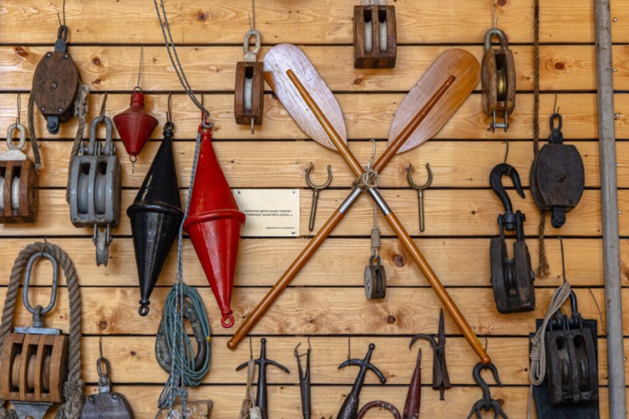 – Здесь есть вёсла, модели кораблей-парусников, старинный кран, манекен рыбака, морской такелаж, ядра, навигационные советские, немецкие и английские фонари, штурманские и навигационные приборы – секстанты XIX века, пеленгаторы, компасы. Особое внимание привлекают часы разных эпох – солнечные, песочные, офицерские, каютные, а также судовые колокола, на которых можно отбить склянку (получасовой отрезок времени на корабле) и почувствовать себя матросом, – рассказывает Виктор.