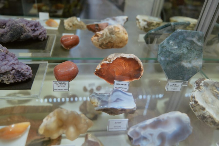 – Особо интересен халцедон виноградный из Индонезии. Он имеет необычную сферическую форму и красиво блестит. Наши соотечественники в Индонезии спускаются в пещеру и добывают редкие минералы, часть которых нам удалось приобрести. Кроме этого, что принимаем участие в аукционах и посещаем выставки, часто принимаем предметы в дар, – рассказывает директор Михаил Красненков. – Нам привозят камни из Аргентины, Бразилии, Китая, Индии, Пакистана, Германии, Доминиканской Республики, с Мадагаскара, Урала. Также сотрудничаем с музеем метеоритов, который предоставляет продукцию и сертификаты.