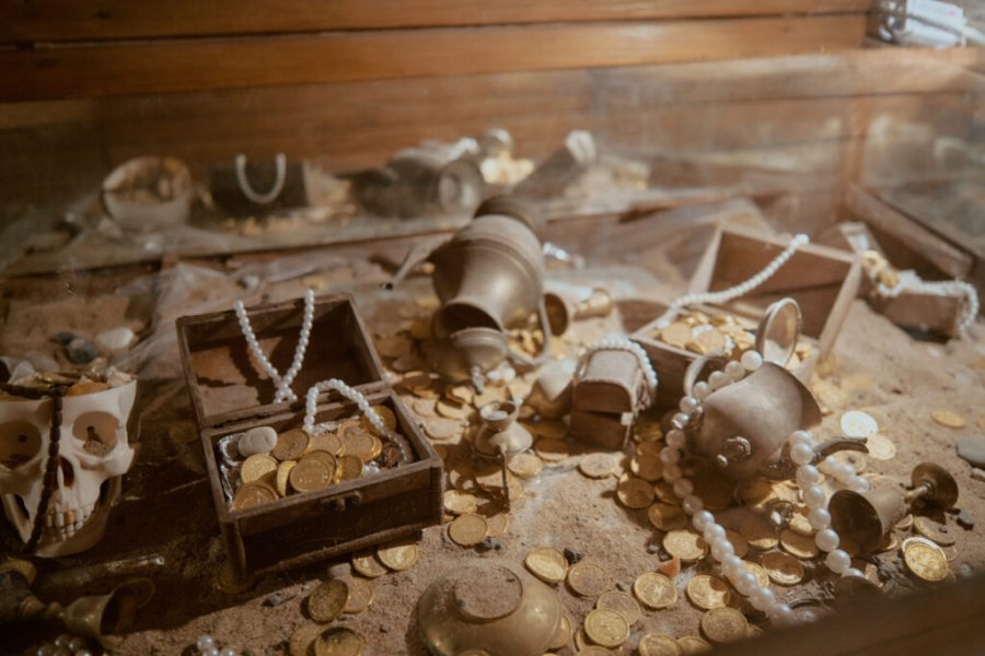 - В музее представлена коллекция старинных монет и драгоценностей, которые ассоциируются с пиратскими захватами. Это золотые дублоны, серебряные пиастры и различные украшения.