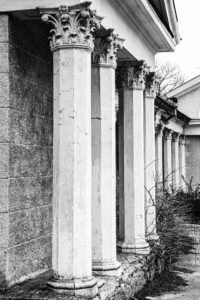 В горный рельеф органично вписаны строения, исполненные в одном из стилей классицизма – коринфском ордере. Он неукоснительно соблюдался даже в деталях. Например, у входа в одно из зданий возвышается ротонда. Круглая в плане двухэтажная башенка с колоннами и куполом возведена просто для красоты.
