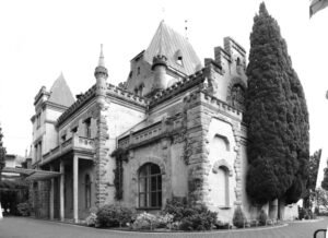 В центре Алушты в тени мощных кедров спрятался небольшой представительный дом. Обращают на себя внимание стены, выложенные из тщательно подогнанных друг к другу многоугольных камней. Сложный узор, который они образуют, можно сравнить с переплетениями человеческих судеб, связанных со старинным зданием. В частности, здесь произошло событие, ставшее отправной точкой в развитии России в начале XX столетия.