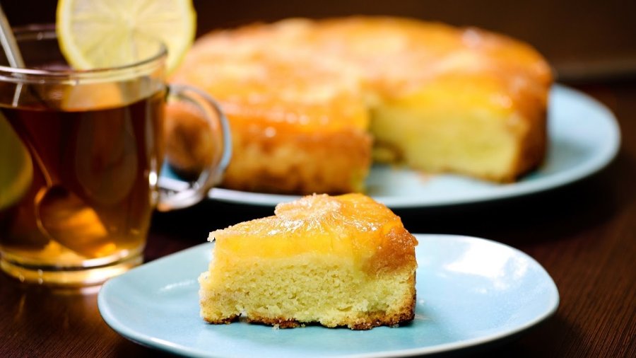 3. Залить полученную смесь в форму. Выпекать пирог около 30 минут. При подаче украсить сверху ананасами.