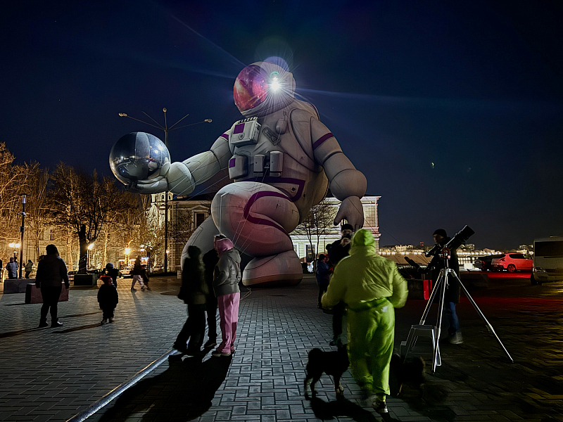 В Евпатории на Фестивальной площади установили тематические надувные фигуры ко дню космонавтики.