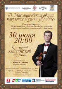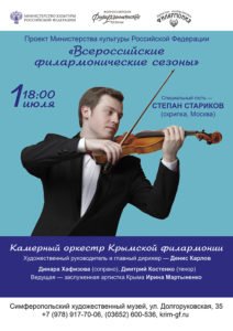 ВСЕРОССИЙСКИЕ ФИЛАРМОНИЧЕСКИЕ СЕЗОНЫ Проект Крымской государственной филармонии и Алупкинского дворцово-паркового музея-заповедника В МАССАНДРОВСКОМ ДВОРЦЕ ЧАРУЮЩЕЕ МУЗЫКИ ЗВУЧАНЬЕ 30 июня, начало в 20:00, ПТ Массандровский дворец, Симферопольское ш., 13, Ялта Камерный оркестр Крымской филармонии Художественный руководитель и главный дирижёр – Денис Карлов Специальный гость Степан Стариков – скрипка (Москва) Динара Хафизова (сопрано) Дмитрий Костенко (тенор) Ведущая — Заслуженный работник культуры Украины, Заслуженная артистка Крыма Ирина Мартыненко