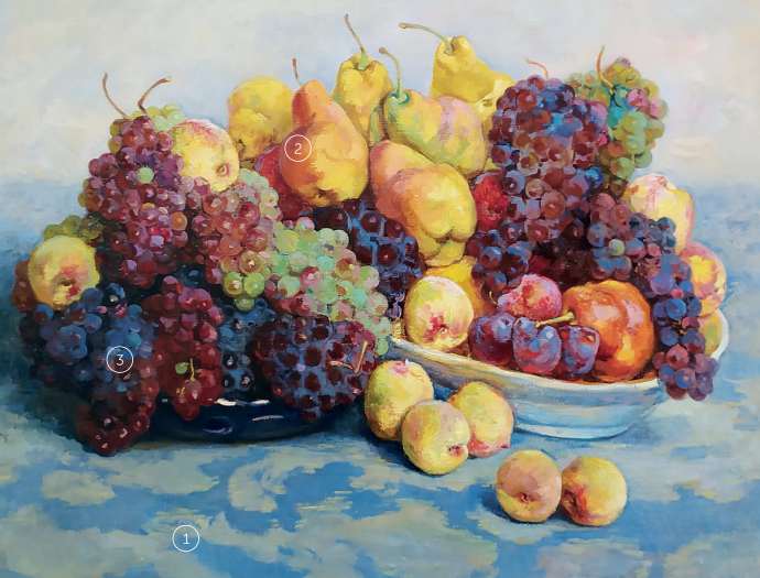 Виноградные грозди, персики, груши – изобилие, сочные краски лета, чёткая передача формы и фактуры. Глядя на эту картину, зритель с трудом сдерживает желание протянуть руку и взять спелый фрукт с белоснежной тарелки.