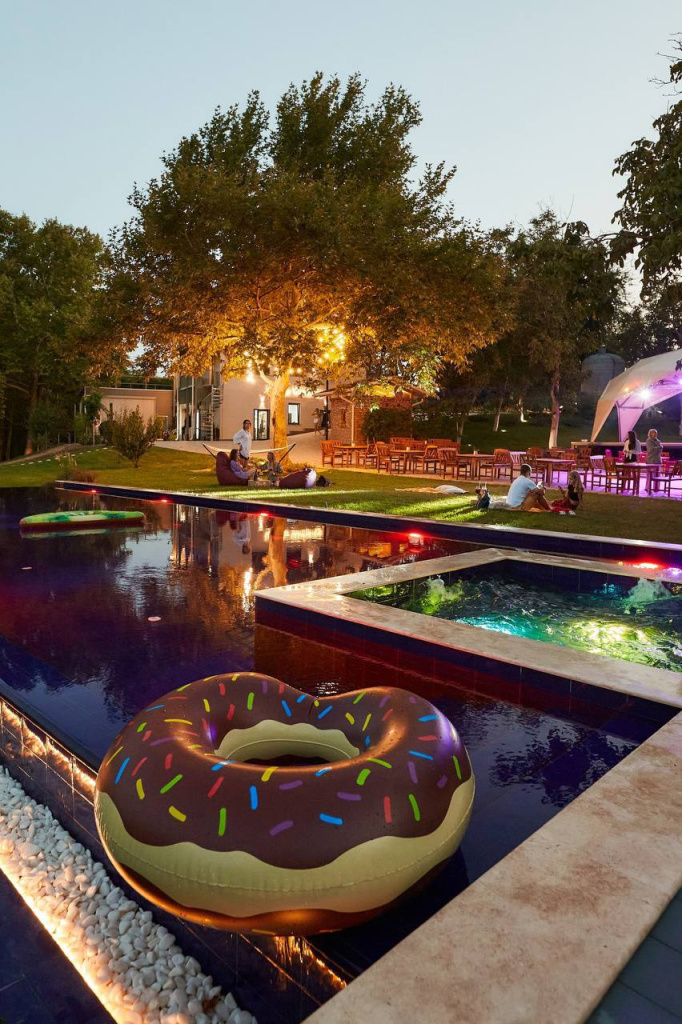 Приехав сюда, можно получить настоящий инфодетокс. Можжевеловая роща, в которой стоят панорамные коттеджи с видом на долину, и живописные виноградники. Здесь время замедляется, происходит синхронизация с природой. Тишину время от времени нарушают разве что мелодии виниловых пластинок. Но заполнить досуг есть чем: вблизи виноградников регулярно проходят кинопоказы, джазовые вечера, тематические вечеринки. К примеру, итальянские, которые за несколько сезонов стали доброй традицией.