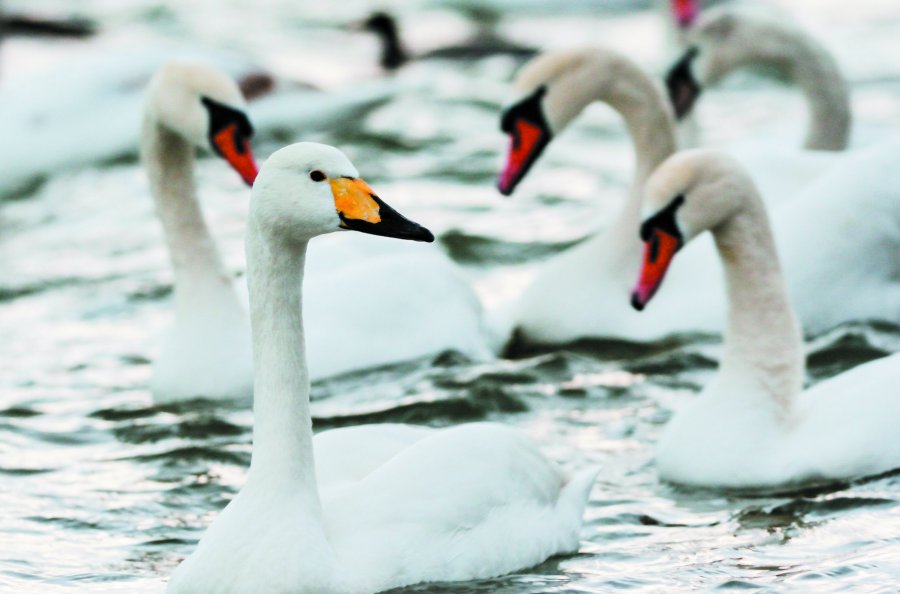 Лебяжьи острова оправдывают своё название и спустя почти полтора века. На зимовку здесь остаются до 5 тысяч сибирских лебедей-шипунов и лебедей-кликунов – красавцев- «блондинов» с ярко-жёлтыми клювами. Традиционно их путь лежал в Турцию и Северную Африку, а Крым служил всего лишь «базой отдыха». Шутка ли, пролететь более 3,5 тысячи километров без передышки. К примеру, от Кандалакшских тундр до солёных озёр Туниса по прямой более 3600 км. Оставались на полуострове старые, больные, ослабленные долгим перелётом птицы. Постепенно к ним присоединились и здоровые, решившие, что Крым и есть тёплые края. Меняющийся климат служит тому подтверждением – залив практически не замерзает, а если это и случается, как во время визита корреспондента и фотографа «Крымского журнала», то всегда остаются большие полыньи. Кстати, обледеневшая береговая зона – дополнительная защита от навязчивого внимания редких гостей.