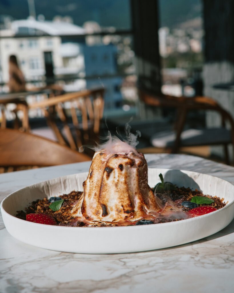 Тирамису в виде вулкана с меренгой и ягодным соусом