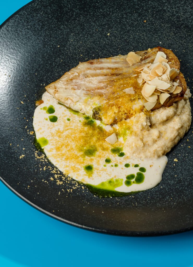 Обжаренное с двух сторон рыбное филе подают с пюре из лепестков миндаля, а сверху укрывают сливочным соусом с боттаргой.