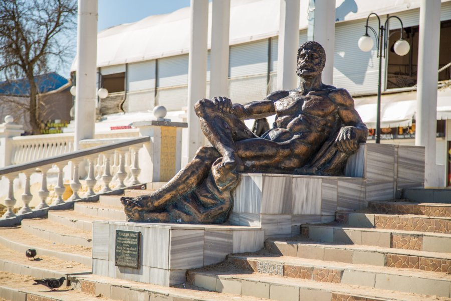 Всем своим безмятежным видом полубог-получеловек утверждает: «Весь мир – для подвигов. Но Евпатория – для отдыха!» Интересно, что более полувека назад тот же Алексей Шмаков изваял для города другую скульптуру – «Мальчик с гирей». Она изображает юного крепыша, который намеревается осилить пудовую гирю. Скульптуры находятся недалеко друг от друга, так что можно утверждать, что это один и тот же образ Геракла, воплощённый в разные периоды его жизни.