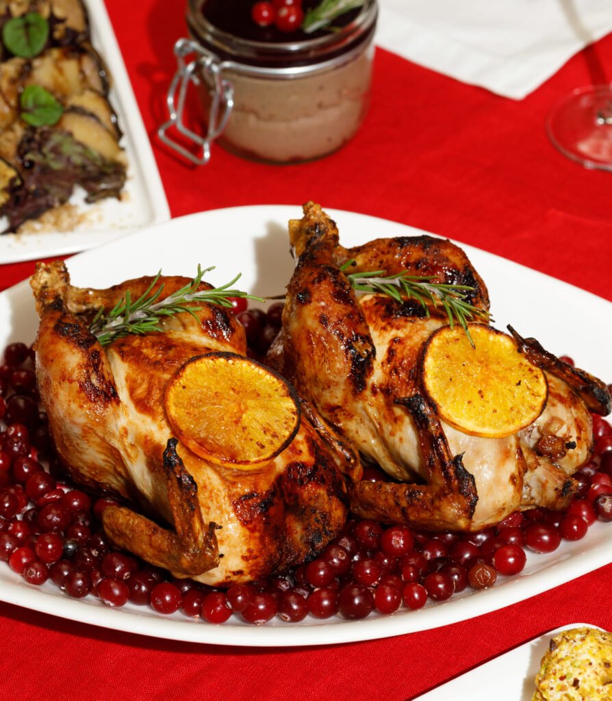 Выложите цыплят на большое блюдо, украсьте запечёнными ягодами.