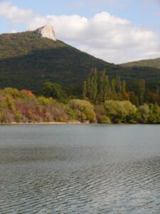 Плывёт вдали айсберг Белой скалы, за ней угадывается степь. Голубеют на горизонте вершины, охраняющие ведущий на Южный берег перевал Каллистон, в переводе с греческого «прекраснейший». Отлично видно слегка холмистое плато Караби-яйлы – царство пещер. Аквамарином сияют многочисленные ставки близлежащих селений – мечта рыбаков. И всюду, на сколько хватает глаз, – заросшие лесом хребты, очень похожие на волны.