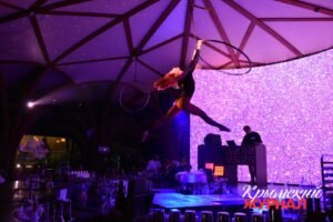 Вход в заведение невозможно пропустить. На берегу Черного моря на набережной вверх поднимаются освещенные ступеньки, а со второго этажа прекрасно видно крымские горы и бухту. Внутри Ptizza Bar разделен на зону для посетителей и барную стойку со сценой, прямо на ней и проходят выступления эквилибристов — под куполом закреплены несколько колец. Перед началом Ptizza show окружение резко меняется, погружая гостей в атмосферу загадки: по всему заведению музыка становится более ритмичной, а огромные экраны начинают отображать фоны для соответствующего выступления. Купол и трюки актеров навевают атмосферу цирка, и это не случайно! Управляющий Ptizza Bar подтвердил, что заведение действительно берет свое вдохновение из цирковых выступлений и той самой атмосферы детского предвкушения чуда.
