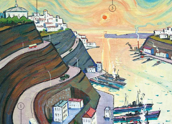 Перед зрителем разворачивается панорама Южной бухты Севастополя – от портовой части города и морзавода до Константиновской батареи, замыкающей бухту вдали справа. Слева на холме возвышается кипенно-белое здание панорамы «Оборона Севастополя 1854-1855 гг.», архитектурные доминанты Центрального холма и Графской пристани. Все элементы пейзажа условны, но легко узнаваемы, а «наивная» трактовка форм лишь подчёркивает необыкновенную точность цветового решения в изображении природы в час заката.