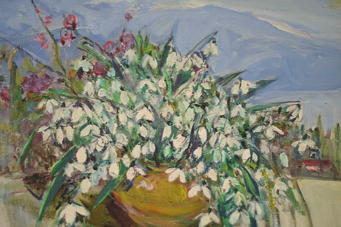 Валентина Петровна любила писать картины на балконе своей ялтинской мастерской, откуда открывался панорамный вид на горы и море. «Подснежники», возможно, написаны именно там. На белом подоконнике стоит низкая керамическая ваза с роскошным букетом белых подснежников, из-за которых выглядывают веточки цветущего миндаля. Это цветочное великолепие расположено на фоне голубых гор и моря, вечнозелёных кипарисов и домика с красной крышей.