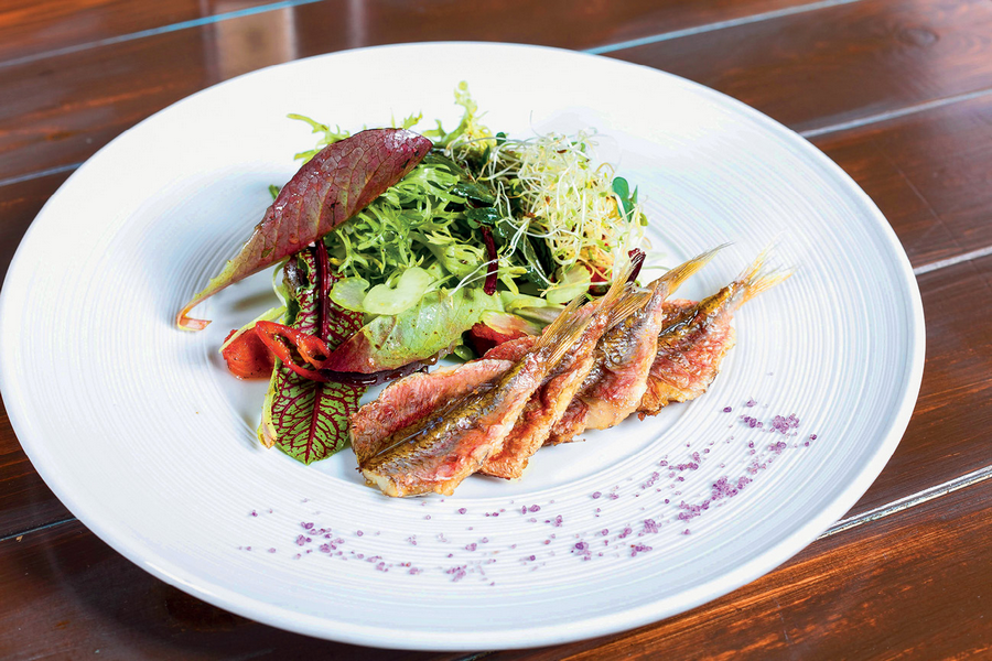 Филе барабули предварительно маринуем в соке лимона, оливковом масле и смеси перцев. Обжариваем на сковороде с добавлением тимьяна. В микс салатов добавляем стебель сельдерея, оливково-бальзамический соус, вяленые томаты, помидоры черри, перец чили. Всё это смешиваем. Выкладываем ассорти зелени и овощей, рядом кладём жареное филе барабули, декорируем зеленью и солью, крашенной соком краснокочанной капусты.