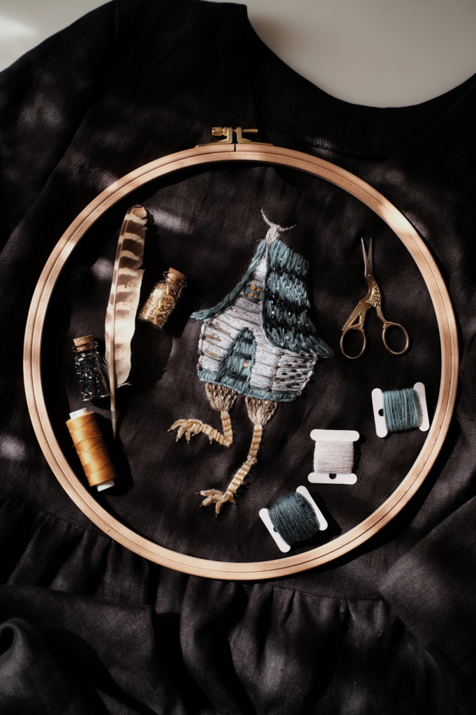 Помимо украшений, у бренда есть коллекция одежды. Например, льняное платье с ручной вышивкой «Избушка на курьих ножках» – смело, необычно и по-настоящему сказочно.