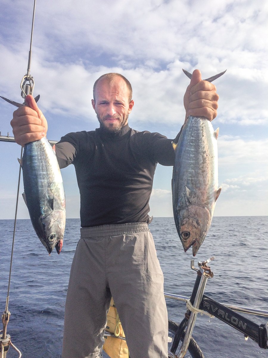 В каждой новой стране мы пробуем местную кухню и экспериментируем с экзотическими продуктами. Готовим максимум на два дня, мясо и рыбу едим свежими. У нас нет холодильника, и мы отлично без него справляемся. Овощи и фрукты можно запасти на несколько дней. В плавание любим брать сухофрукты – это отличный источник энергии. На ходу ловим рыбу. Тунец и скумбрия – наши любимцы. Вкуснее всего малосольные. А Филипп с удовольствием уминает за обе щеки хамон с оливками.