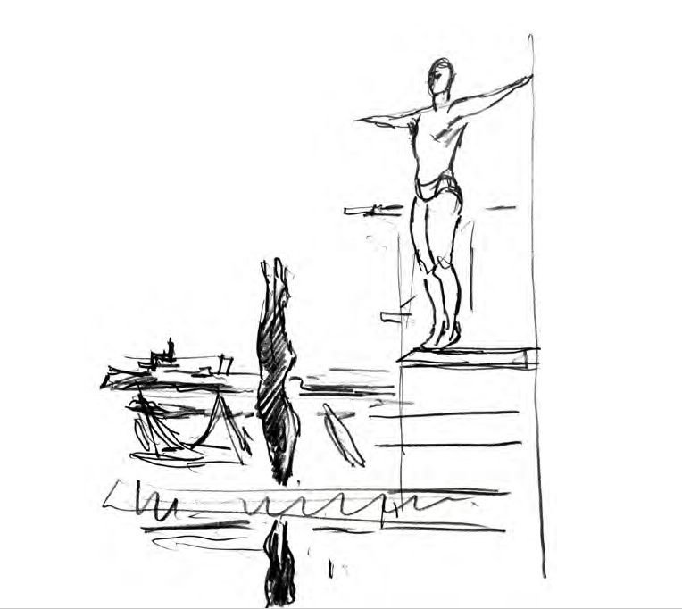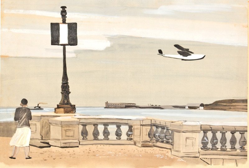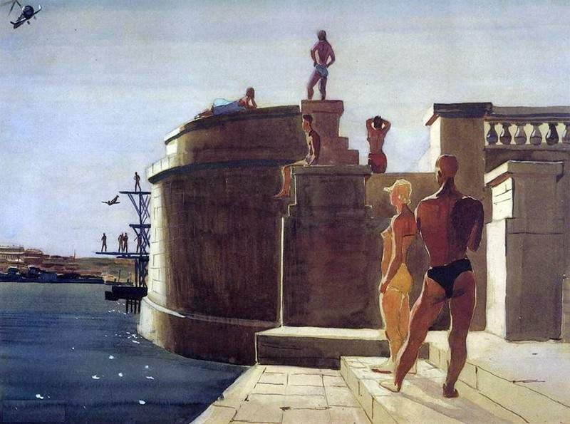 Иная сценка схвачена в акварели «Водная станция Динамо»: на фоне массивной постройки атлетически сложенные мужчина и женщина. Однако их внимание приковано не друг к другу и даже не к вышке для прыжков, откуда ласточкой слетает очередной смельчак, а к зависшему высоко в небе чуду техники – автожиру, прообразу вертолёта.