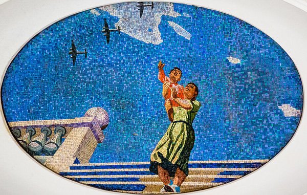 На каждом из тридцати с лишним плафонов показано бескрайнее, уходящее ввысь небо. «Глубинная мозаика» будто пробивает 40-метровую толщу земли и создаёт в подземном дворце ощущение безграничной свободы. Это впечатление подарил Севастополь, и благодарный мастер бережно воплотил его в столице.