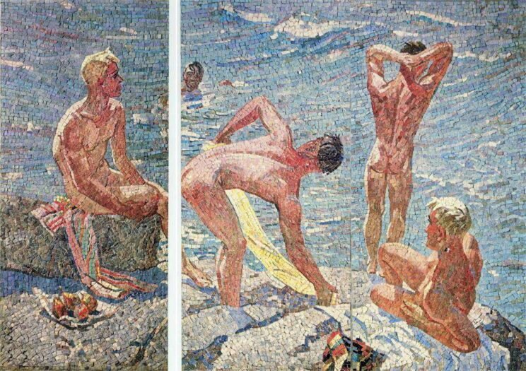 Тёплые ноты зазвучали и в новых работах неисправимого жизнелюба. В центре Москвы он оформил салон массандровских вин, украсив его стены дивными фресками, воспевшими виноделов Тавриды. Подобно солнечным лучам, радостью бытия пронизаны живописные произведения, посвящённые отдыху в Крыму. «В здоровом теле – здоровый дух!» – вот-вот проскандируют, кажется, крепкие парни с мозаики «Хорошее утро». Герои картин показаны не в самоотверженном труде или смертельном бою. Их обнажённые тела олицетворяют физическое, душевное и социальное благополучие, и утопические фантазии художника о счастливой стране обретают зримые очертания.