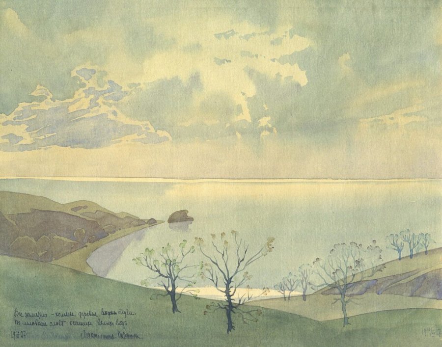 Ряд акварелей живописец сопровождает малыми стихотворными формами. Это может быть двустишие, иногда мысль творца отмечена одной-единственной строкой. Максимилиан Александрович считал эти надписи не заглавием, диктующим зрителю, что он должен увидеть, а аккомпанементом, звучащим в унисон с изображением. Попробуйте прочесть вслух надписи к нескольким акварелям, и их краски и образы буквально предстанут у вас пред глазами: «Твой влажный свет и матовые тени дают камням оттенок бирюзы»; «В скорбном золоте листов гор лиловые мотивы»; «К лазурному заливу тропы бегут по охряным холмам»; «Ртутный отблеск и сиянье оссиановских ночей»…
