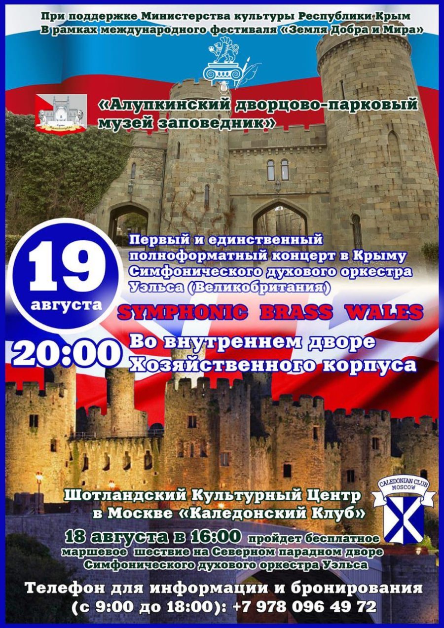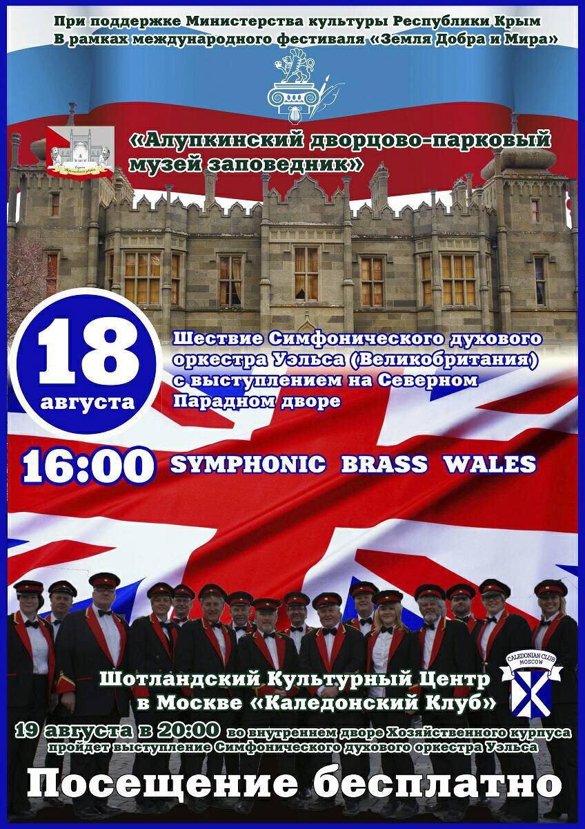 Выступление Симфонического духового оркестра Уэльса стало возможным благодаря завязавшимся хорошим отношениям с Шотландским культурным центром «Каледонский клуб». Алупкинский дворцово-парковый музей заповедник уже становился площадкой маршевых выступлений шотландского оркестра волынщиков из Новой Зеландии в марте этого года.