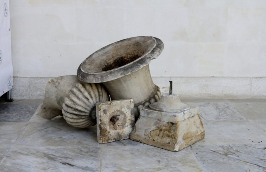 Когда-то эти вазы украшали подпорную стену под зданиями Дома барона Фредерикса и Свитского дома на территории дворца. Всего изделий было 16. Кроме них похищены были ещё 9 ценностей.