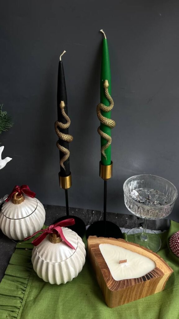 Не смогли пройти мимо Eco candle simf, который выпустил новогоднюю коллекцию восковых свечей. В ассортименте – классические столовые свечи, свечи в виде лотоса, а также набор из трёх магических свечей, которые «запрограммированы» на благоприятный запуск 2025 года.