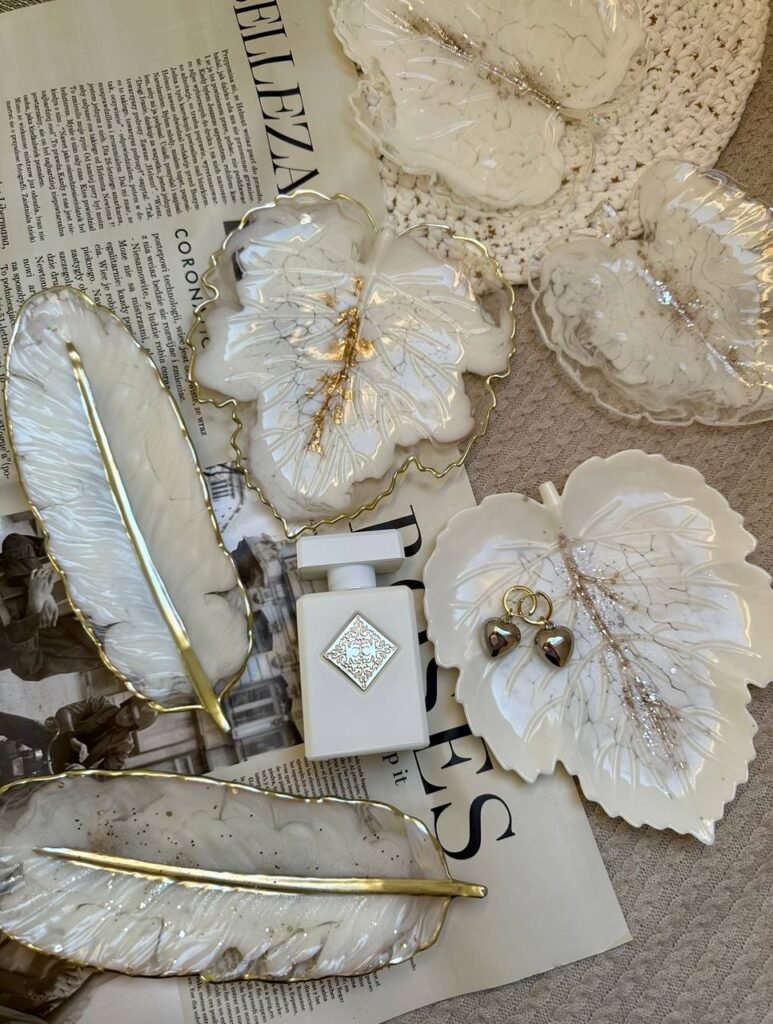 Помимо игрушек, можно заказать другие изделия из эпоксидной смолы. Например, часы, подставки под украшения, подносы, вазы для фруктов, наборы для сервировки стола, детские метрики и даже журнальные столики.
