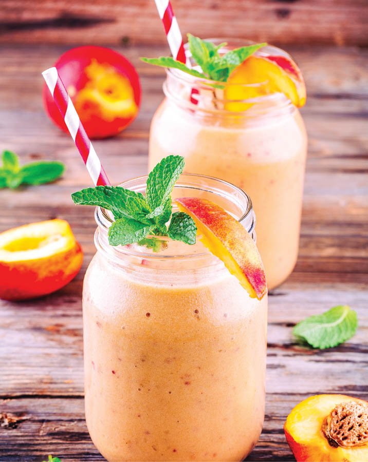 Щепотку мускатного ореха, нарезанные на несколько частей персики (или инжир) измельчить в блендере до образования однородной массы. Затем влить кефир и ещё раз взбить. Разлить в бокалы, по желанию украсить веточкой свежей мяты и нарезанным дольками персиком. Если любите сладкое, добавьте ложку крымского мёда. Хранить смузи не стоит, им нужно насладиться сразу, поскольку при хранении все полезные свойства разрушаются.